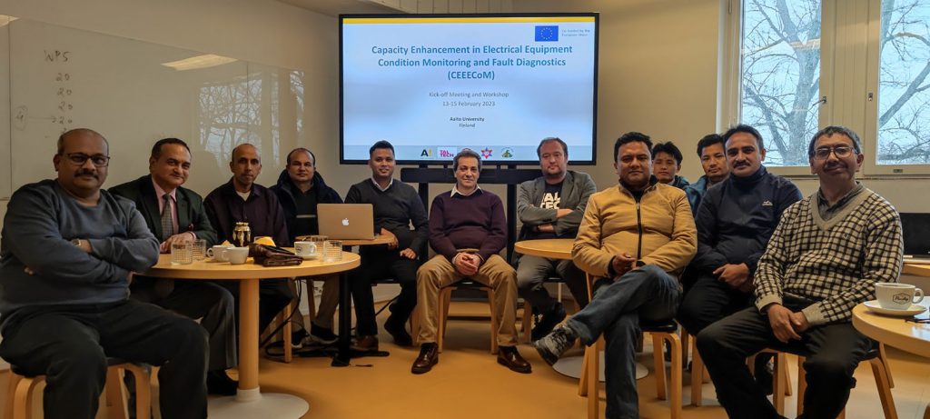 The kick-off meeting, kick-off workshop and laboratory and industry visit of CEEECoM has recently been organized from 13th to 15th February 2023 at Aalto University, Finland which is the coordinating partner for the project. During the three days event, the participants were introduced to details about objectives, deliverables, and timelines of activities by coordinating partners and the work-package leader. From JNEC, RUB, three-member teams led by Mr. Hemlal Bhattarai, Asst. Professor who is the project manager for CEEECoM accompanied by Mr. Sangay Chedup, DRIL and Mr. Karma Singye, Lab. Technician (DEE) attended the event and has done a presentation about work packages 2 and 7 which is led by JNEC, RUB.